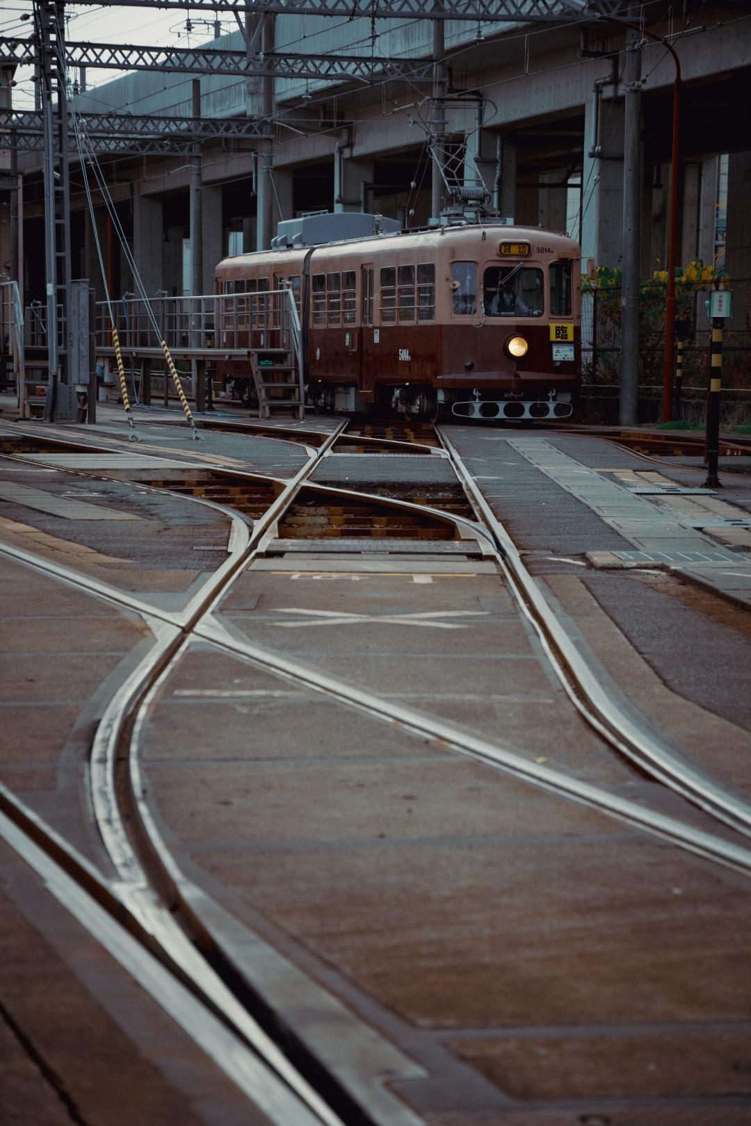 あずき色とベージュのツートンカラーの電車、5014号。