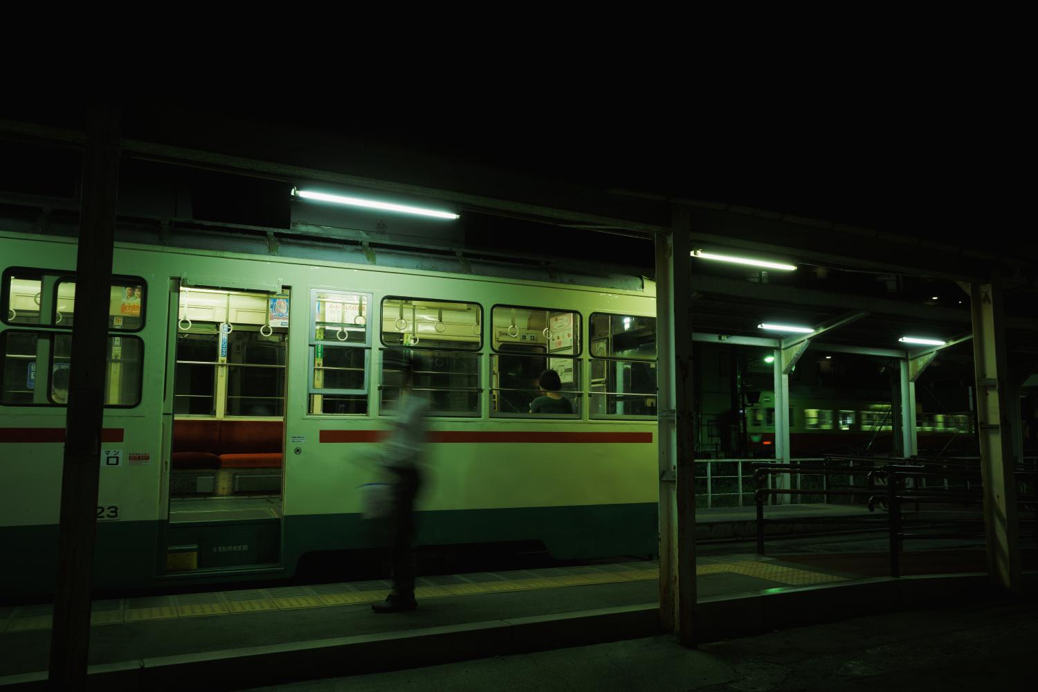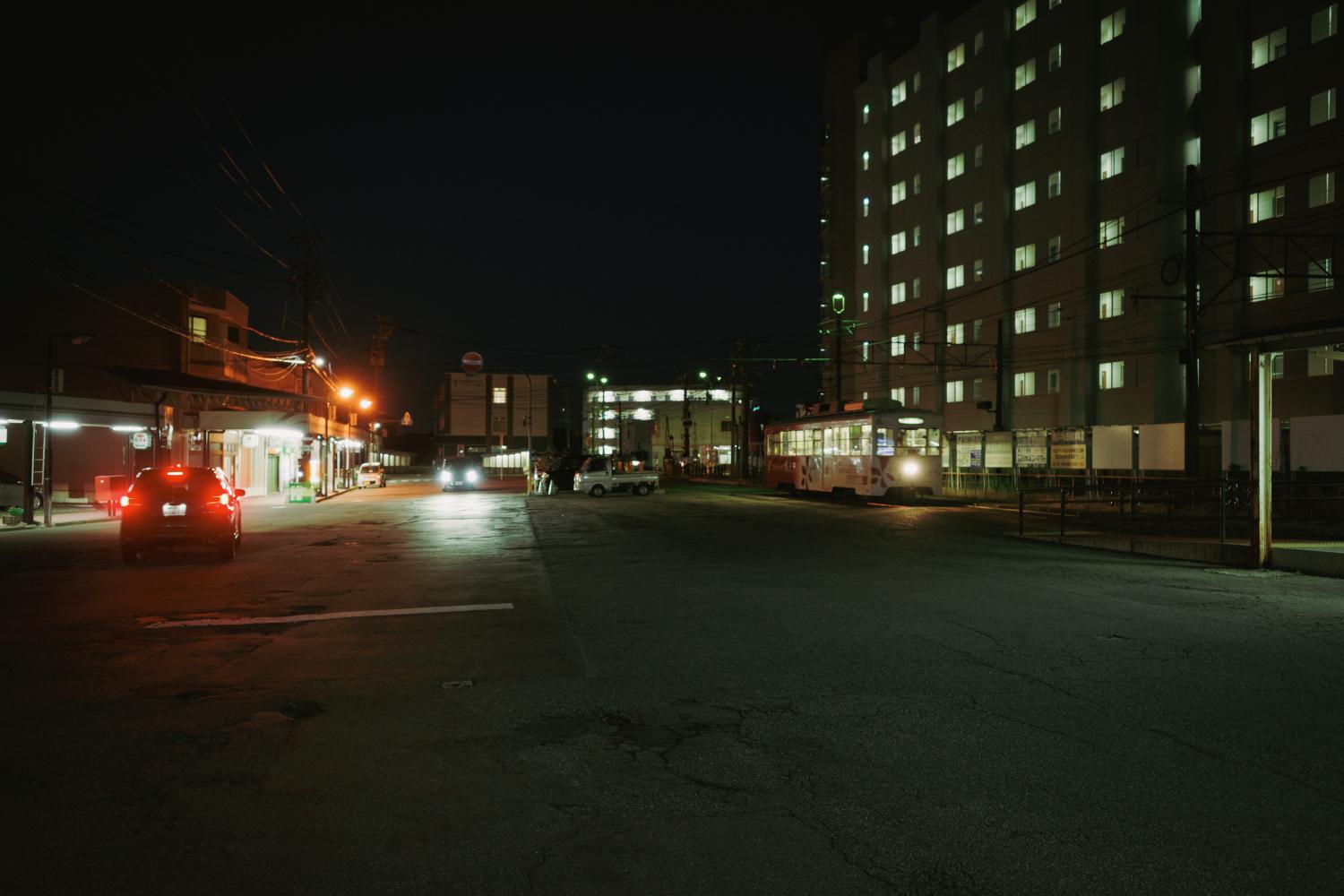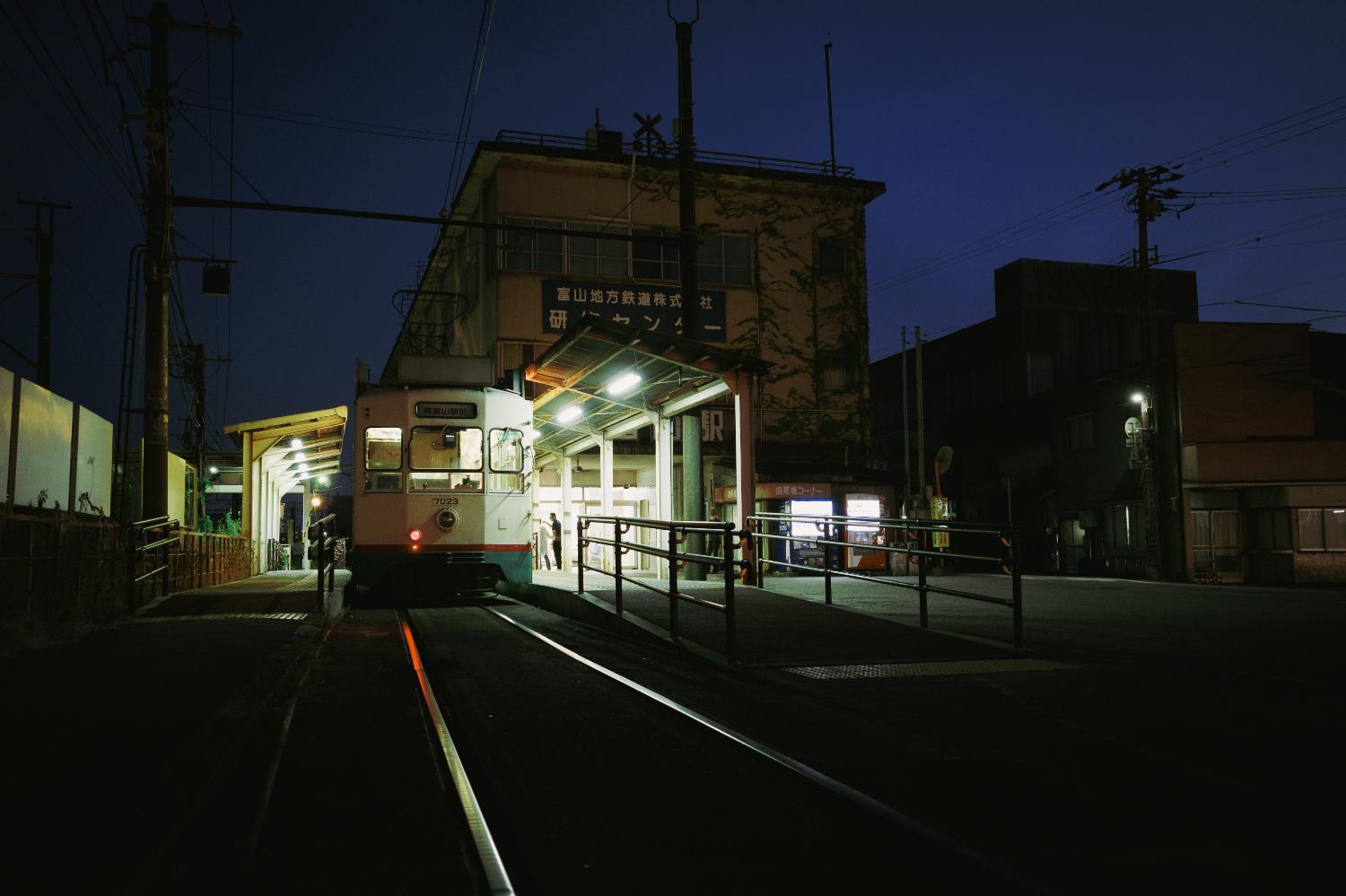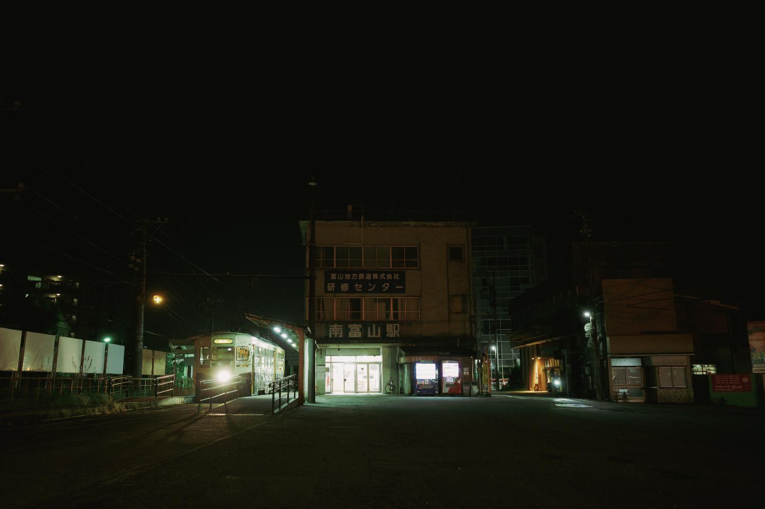 夜の南富山駅前は、デ7000型の心地よいコンプレッサーの音だけが響く。気づけば人もまばらだ。電車と送迎のクルマだけが佇む。