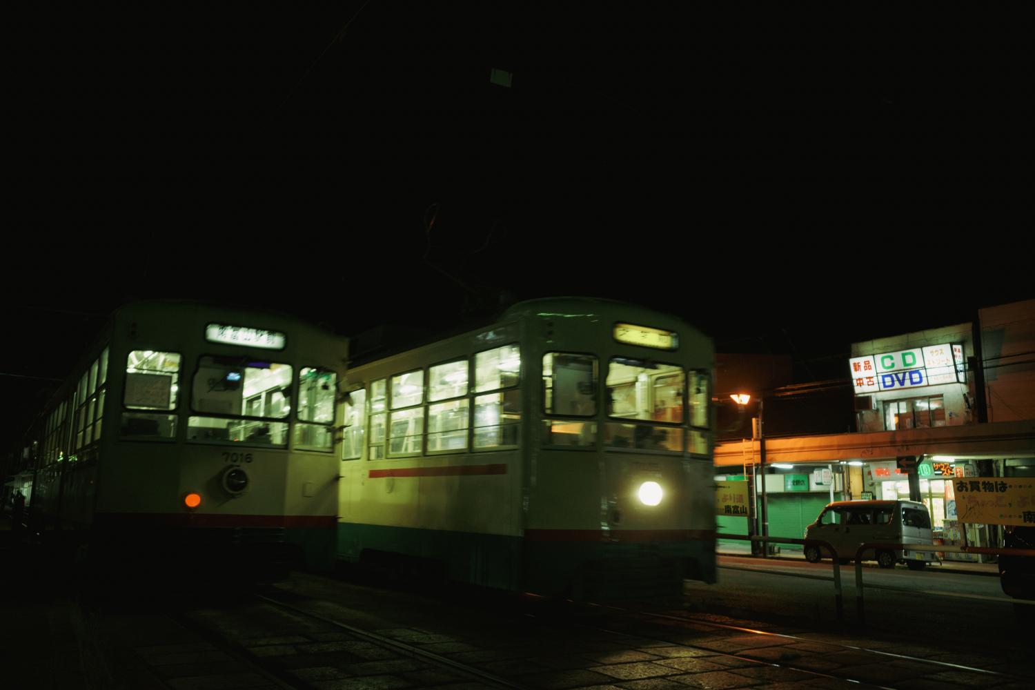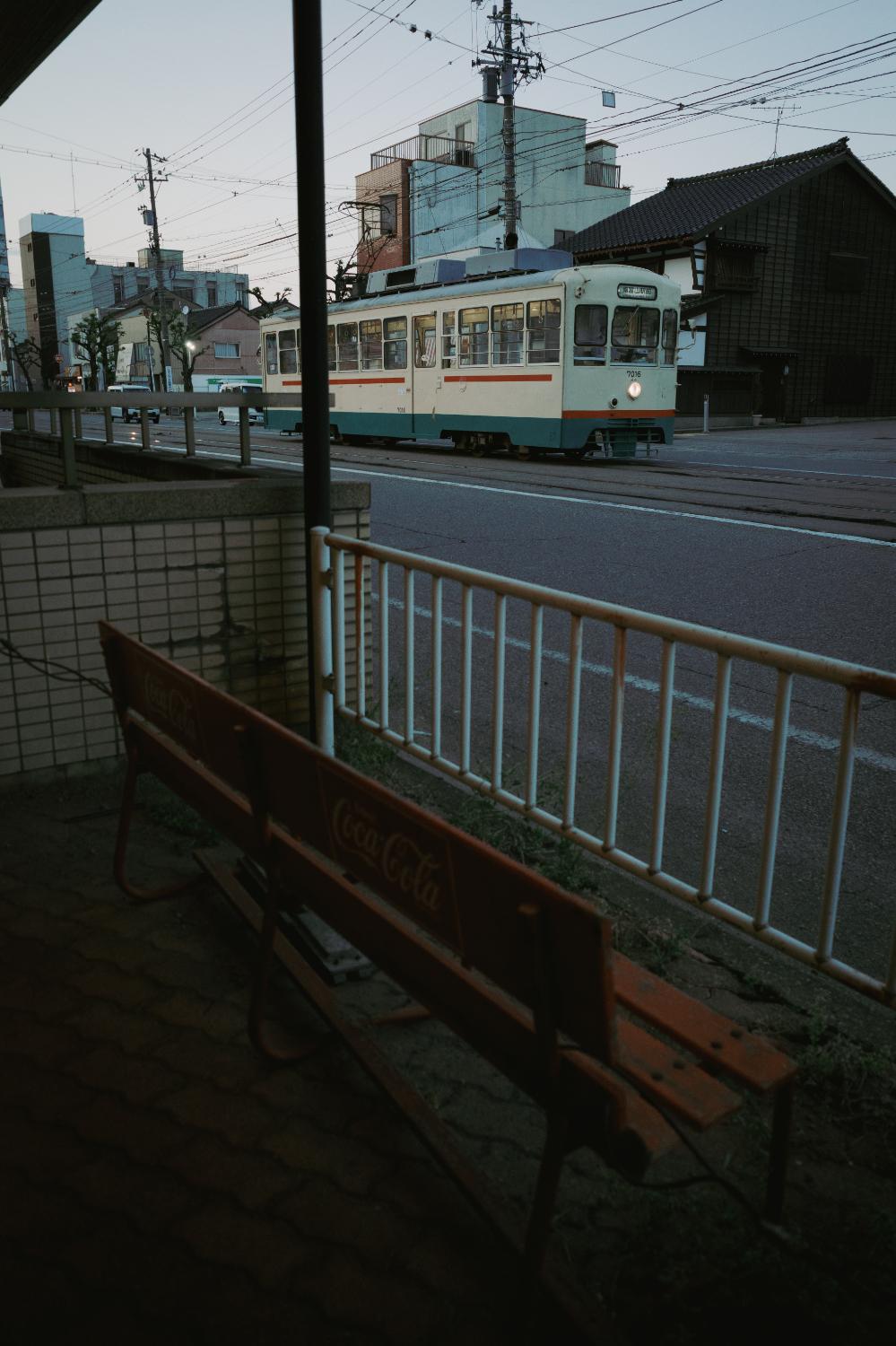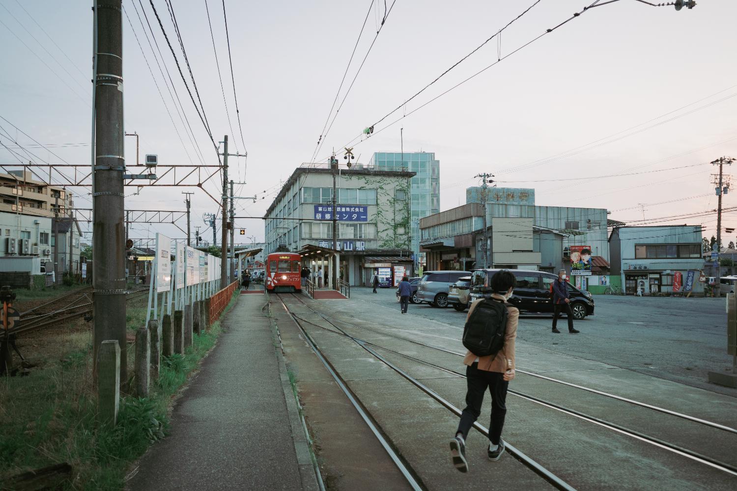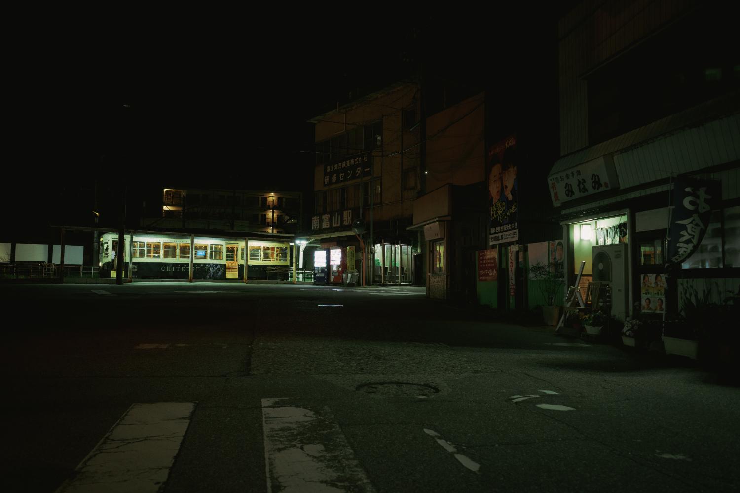 夜の南富山駅前は、デ7000型の心地よいコンプレッサーの音だけが響く。気づけば人もまばらだ。電車と送迎のクルマだけが佇む。