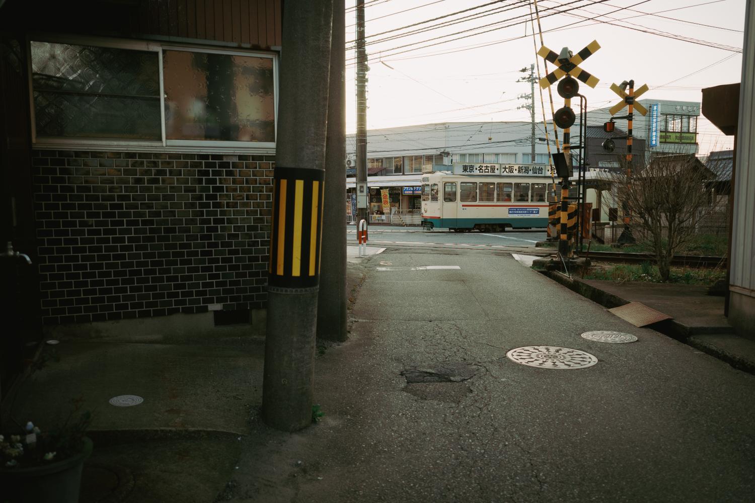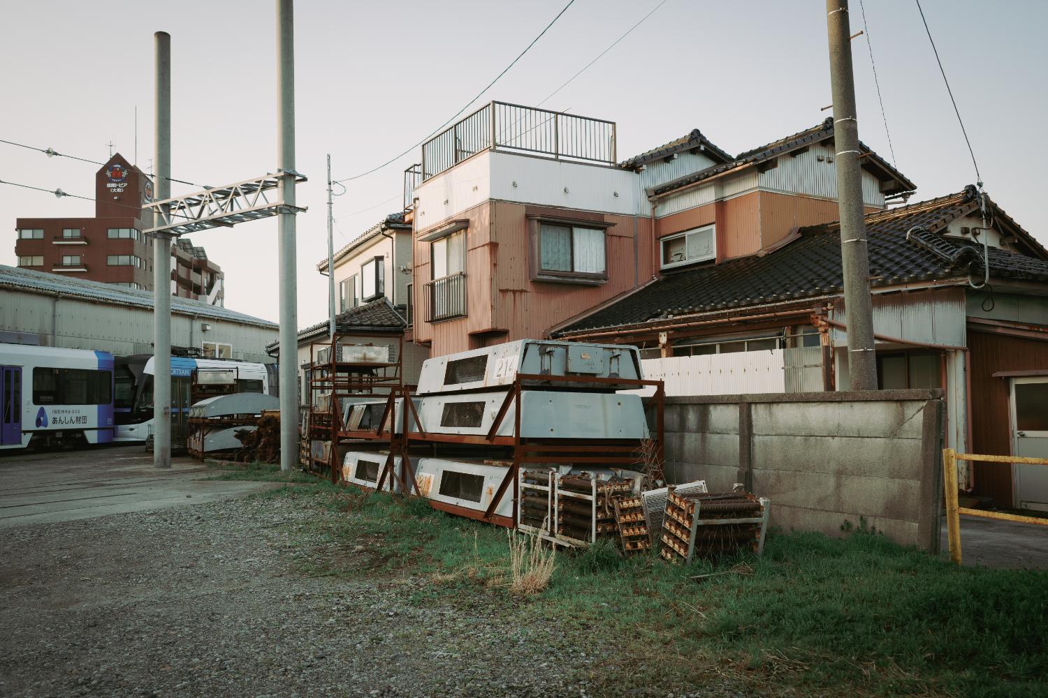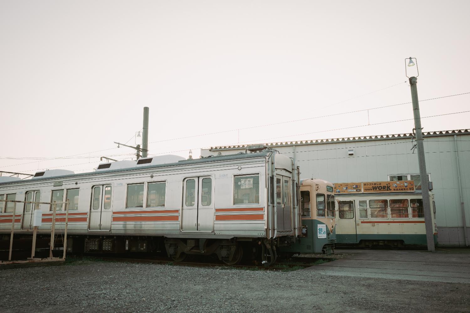 駅と駅前食堂の間の道を進むと、地鉄電車の車庫がある。